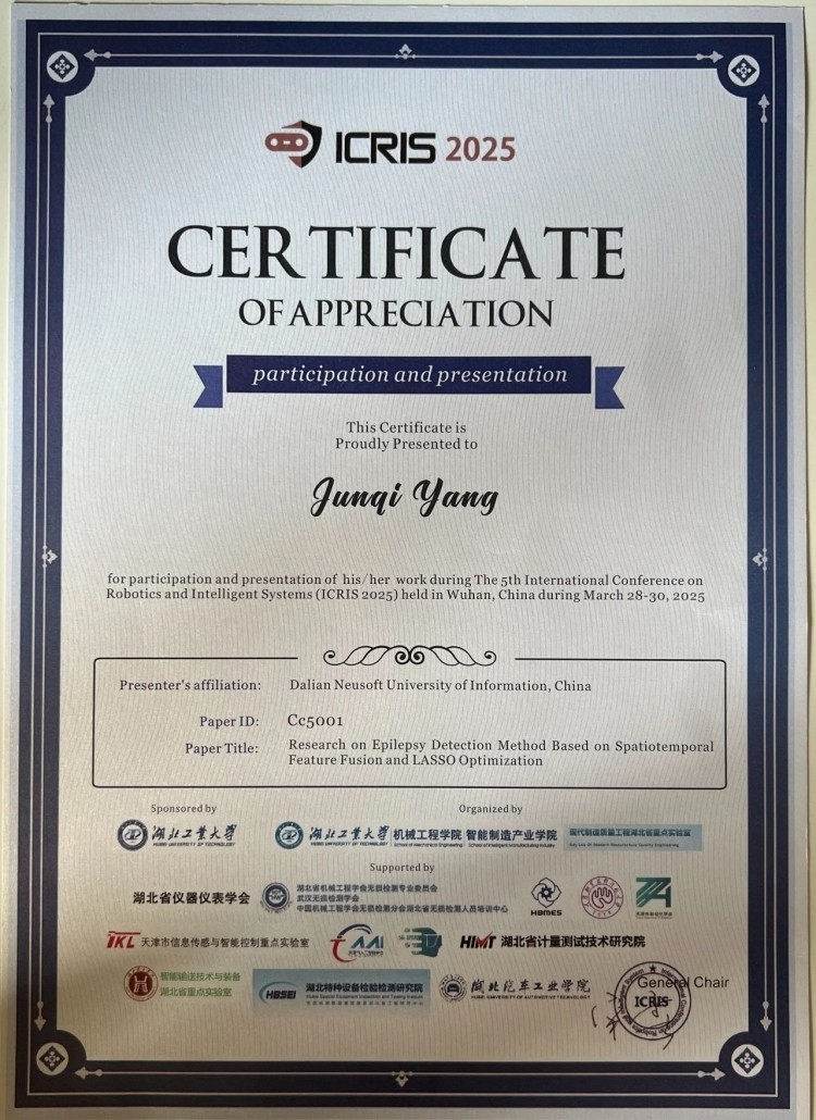 Yang Junqi's paper addresses the challenge of intelligent detection of epileptic pathological signals, proposing the TSL algorithm, which combines spatiotemporal feature fusion and LASSO optimization. By analyzing the high-dimensional spatiotemporal characteristics of EEG signals and optimizing machine learning models, the study achieved a breakthrough in accuracy and sensitivity on the CHB-MIT clinical dataset, offering an efficient and reliable AI solution for early epilepsy diagnosis and earning high praise from conference reviewers.